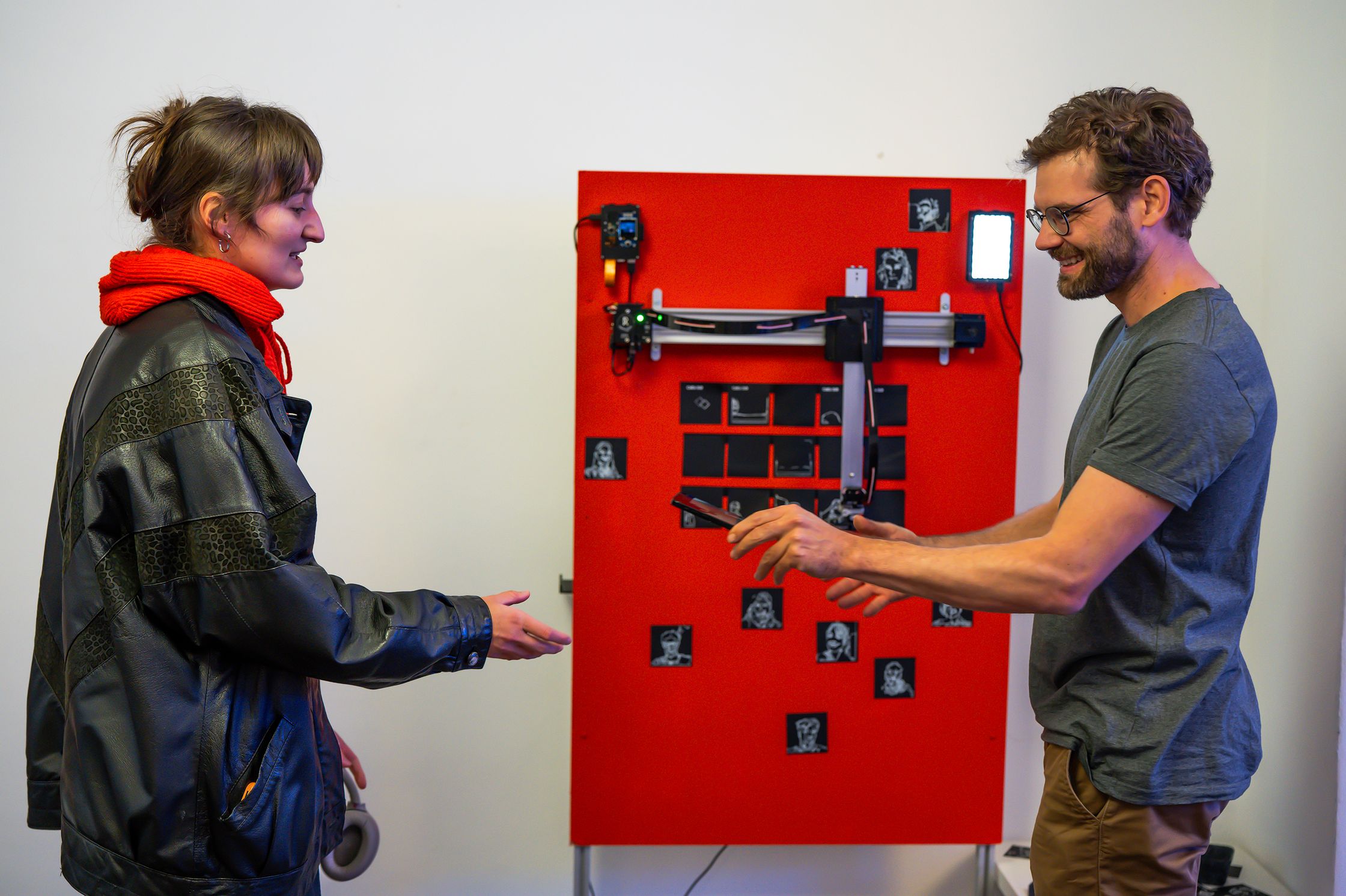 Philipp Lehmann untersucht das Spannungsfeld zwischen technischer Präzision und menschlicher Begegnung. Sein Photoplotter wird nicht als blosses Werkzeug verstanden, sondern als eigenständiger Akteur, der in Dialog tritt und Spuren hinterlässt. Die Maschine reagiert auf die Präsenz des Gegenübers, verwandelt diese in Linien, Formen und Rhythmen – und schafft so Portraits, die weder rein technisch noch rein menschlich sind, sondern im Zwischenraum entstehen.